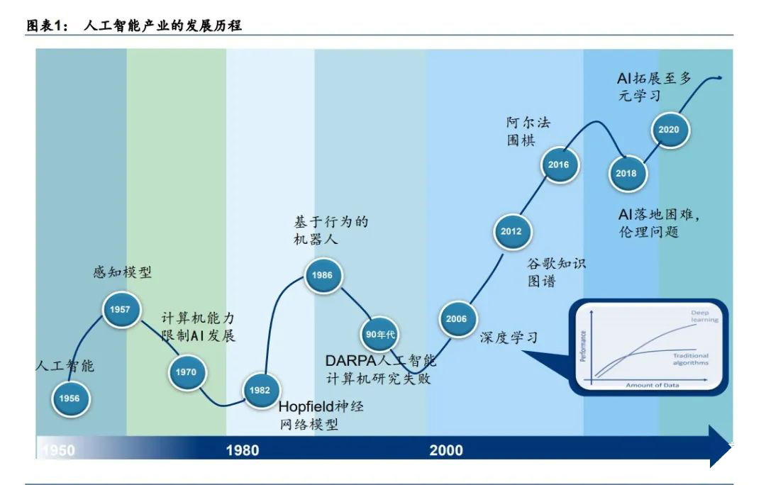 过去十年 AI 产业迎来了历史上第三波,也是 70 多年发展中最快速的一波发展。基于深度 学习理论,AI 在数据的驱动下,在人脸识别、文本翻译等特定领域已经达到甚至超过人类 的准确度,同时拥有远超人类的效率。芯片的制程升级和代工模式的发展也使得大数据下 的 AI 得以落地。同时AI 也在改变互联网生态后在软硬件领域拉开帷幕,开始重塑安防等领 域。而 AlphaGo 人机博弈等也帮助 AI 概念的普及。总结看,随着深度学习算法的提出和半 导体行业的突破,叠加成功的内容宣传,过去十年 AI 从专业的技术理论到产业化落地,再到大众认知,形成了跨越式的发展。