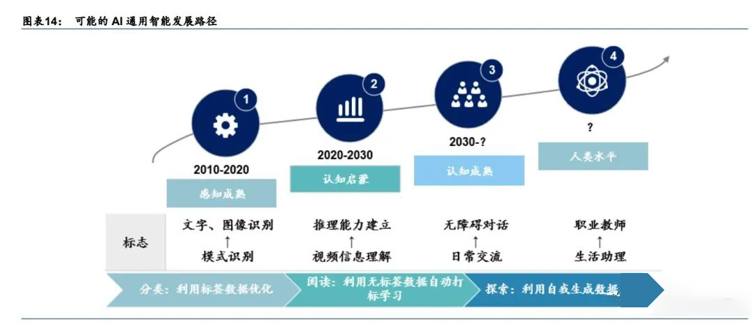 在大量场景下,专用的人工智能已经可以满足人类活动大部分需求。但 AI 经历了多年发展 依然停留在感知层面,难以像人一样做推演式思考。我们认为:未来十年人工智能将与脑 科学融合,发展通用认知智能,对应着人机多轮对话、视频理解等应用。但目前实现路径 存在不确定性,典型的发展思路包括: