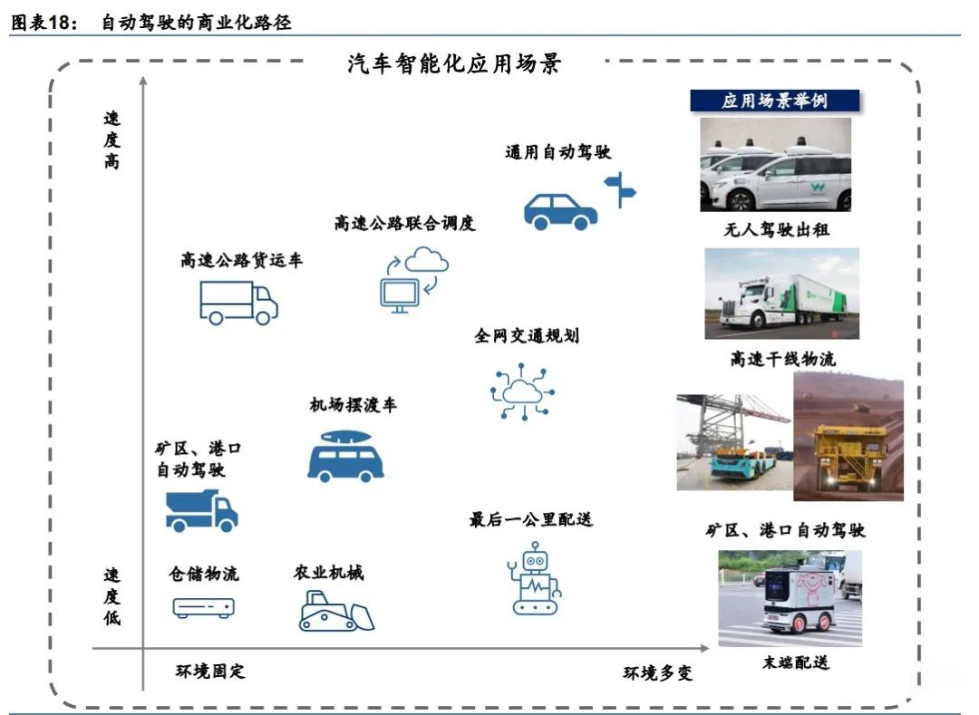 自动驾驶虽然仍有距离,难以明确具体商用时间,但是在慢速场景,如农机、扫地机器人、 快递最后一公里配送等场景中已经实现落地,在未来十年可能会有更多慢速场景自动驾驶 的应用改变人们生活。