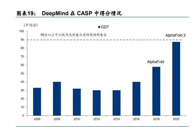 医疗领域最重要的应用是 AI 制药。2020 年,AI 解决了蛋白质结构预测问题,该问题是结构生物学里程碑式的问题。2020 年 DeepMind 凭借“AlphaFold 2.0”算法在权威蛋白质结 构预测评估竞赛(CASP)中排名第一,其主要指标 GDT 得分达到 92.4 分,达到实验室水 平。过去很多年药企就已经广泛地研究和推进人工智能技术,未来十年利用 AI 构建药物结 构成为可能。AI 通过分析论文和临床数据,可以加速药物研发流程。面对新冠疫情,AI 展 现出不俗的效率。2020 年英国公司 BenevolentAI 通过 AI 检索海量文献发现新冠药物。该药物后获 FDA 紧急使用授权。过去两年 AI 制药受到资本市场青睐。目前全球 AI 制药的头部企业包括美国上市公司 Schrodinger(SDGR US)、Recursion Pharmaceuticals(RXRX US)、英国 BenevolentAI(未上市)、和中国晶泰科技(未上市)等。