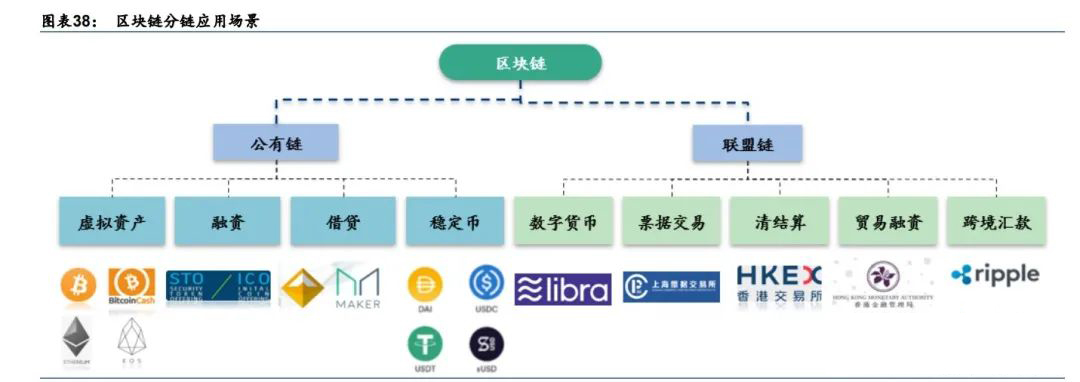 区块链可以分为由开源社区主导的公有链,及大型 IT 或金融企业主导的联盟链。(1)公有链应用以比特币为代表已经全面铺开,完全去中心化,任何人无需授权即可访问, 节点自由出入网络,典型代表有比特币和以太坊。但由于公有链模型复杂,交易承载规模 小,延迟性大,一般适用于虚拟货币、互联网金融等应用场景。(2)联盟链有望实现场景落地。联盟链需要特定节点参与和交易,可实现部分去中心化。因为整个链规模较小、权限易控制、效率高、承载交易规模较大,一般适用于银行间转账、 证券交易所清结算、企业溯源和监控审计等。典型代表有 R3 区块链联盟、超级账本 (Hyperledger)等,是目前金融、公共服务、供应链领域与区块链结合的首选类型。